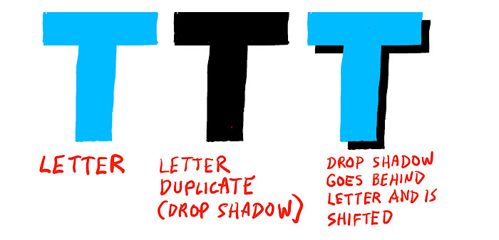 The principle of the drop shadow is that you create an exact duplicate of the letters and shift it off to the side. Drop shadows work best on big, fat letters rather than on thin, delicate letters. Typically, most drop shadows are shifted right and down, but for weird effects, you can shift them in any direction you want. If you’re working digitally, it’s super easy. Just copy the letters, put them on a new layer below and make them black or any other color you like. You can also blur them if you want to make your shadow more shadowy. If you’re hand lettering, you just have to use your eye to draw the drop shadow. I love drawing drop shadows, cause it’s a meditative unthinking task.