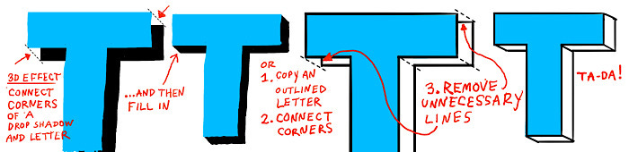 The 3D effect is just a drop shadow where you connect the corners of the drop shadow to the letter. (The visual tutorial below is optional—just use it if you need it .) If you 3D an outlined letter, you’ll get that superhero comic book effect. To create an even greater sense of mass you can make the faces on the bottom darker than the faces on the top and the sides. Thats what I did on the word EPIC above.